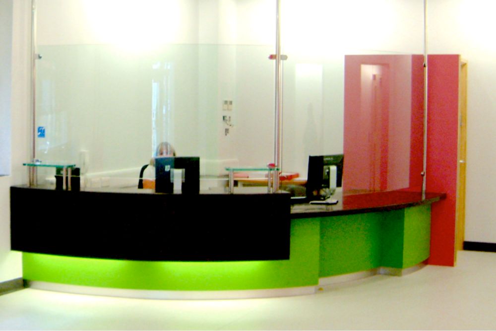 A new draft lobby clearly defines the entrance to the Dental Institute, featuring Schüco curtain walling with passive solar control via an integrated louvre blade system. The design includes a Part M compliant access ramp, ensuring full accessibility in line with hospital requirements, and a modern reception desk to enhance visitor experience.